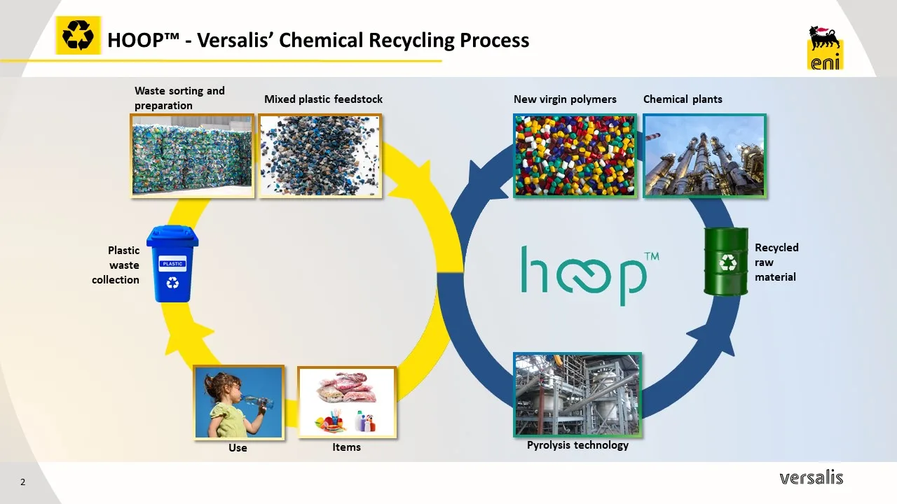 Hoop® is a project launched by Versalis to develop a new sustainable technology and value chain to chemically recycle mixed plastic waste of variable composition with the aim of reaching the highest recovery of material with a low carbon footprint.