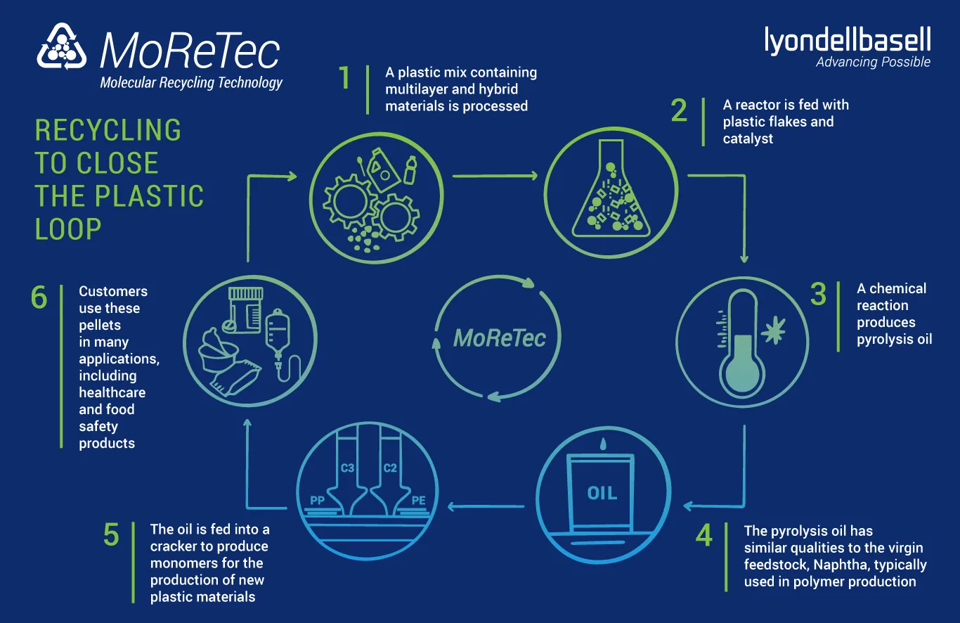 LyondellBasell started up its MoReTec molecular recycling facility at its Ferrara site in Italy in September 2020. LyondellBasell’s proprietary MoReTec molecular recycling technology aims to return post-consumer plastic waste to its molecular form for use as a feedstock for new plastic materials that offer expanded applications, including medical and food packaging.
