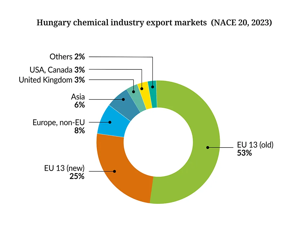 The performance remained export driven, in 2023: 62,7% of chemicals and chemical products manufactured in Hungary are exported and sold predominantly in the EU Single Market. Unfortunately there is a significant decreasing in export ratio compared to 2021 (67,2%).