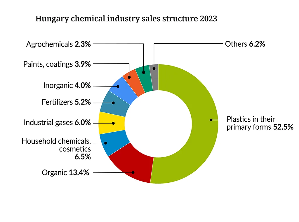 The chemical industry plays an important role in Hungary’s economy. Sales of Hungarian chemicals and chemical products nearly doubled between 2009-2021, registering a growth rate above the EU chemical industry average and touching level of pre-COVID period again. From the middle of 2022 Hungarian chemical industry have been facing permanent and serious competitiveness challenges. Chemical industry output, including the manufacturing of plastics in their primary forms, organic and inorganic chemicals, fertilizers and other agrochemical products, paints, home and personal care raw materials and other consumer chemicals dropped down from over 20% to 17,3% of the total processing industry of the country. The weight of chemical industry output has decreased both in domestic and export sales within processing industry performance. Hungary remained a leading producer of acryl based carbon fibers.