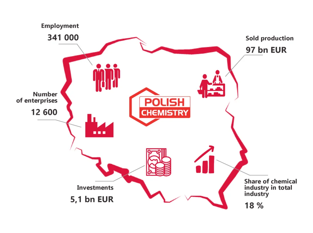 The chemical industry has a very high position among industrial sectors of the Polish economy. The share of chemical industry in the total industry is 18.0%.