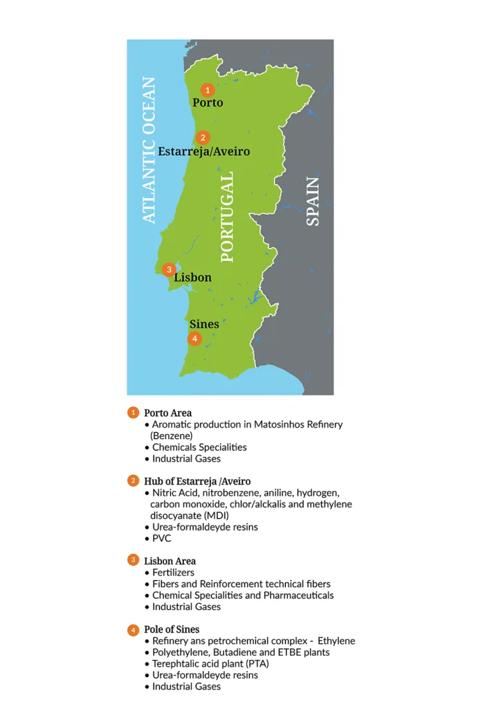 Geographically, the chemical industry in Portugal is mostly located in two defined chemical industry hubs in Estarreja and Sines, and in the industrialized metropolitan areas of Lisbon and Oporto.