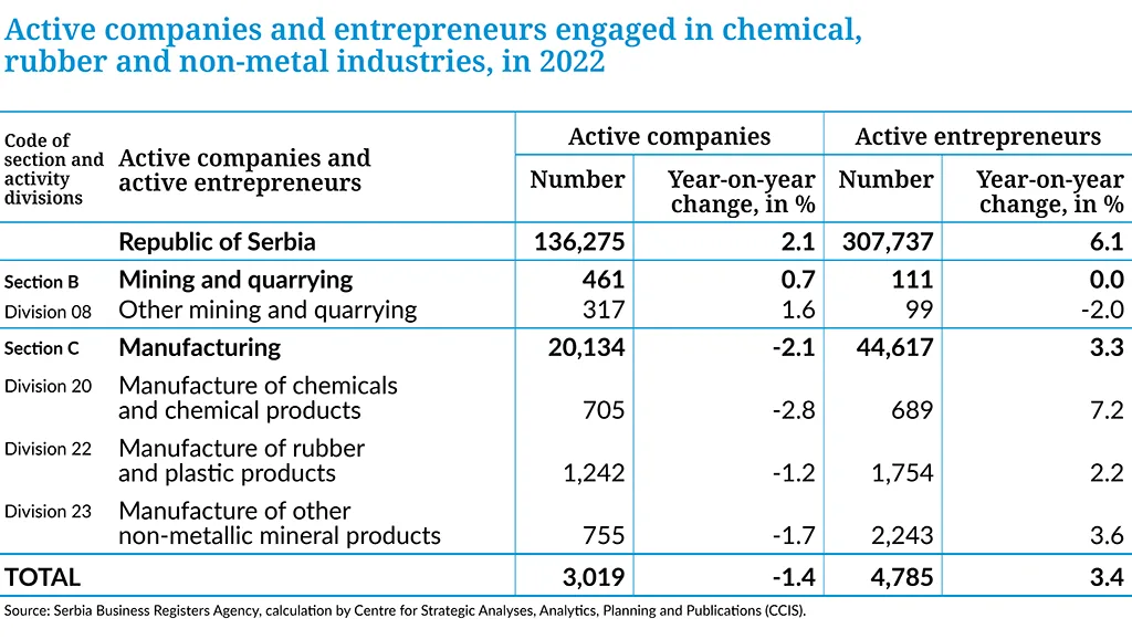 According to the calculations of the CCIS, and based on the data of the Business Registers Agency, in 2022, 3,019 companies operated in the chemical, rubber and non-metal industries, which accounts for 2.2% of the total registered companies in the Republic of Serbia. Out of that number, the majority of companies are registered for the manufacture of rubber and plastic products (41.1%). Somewhat lower number of companies operated in manufacture of non-metallic mineral products (25.0%) and the activity of manufacture of chemicals and chemical products (23.4%). The lowest number of active companies (10.5%) is in the activity of other mining and quarrying.
