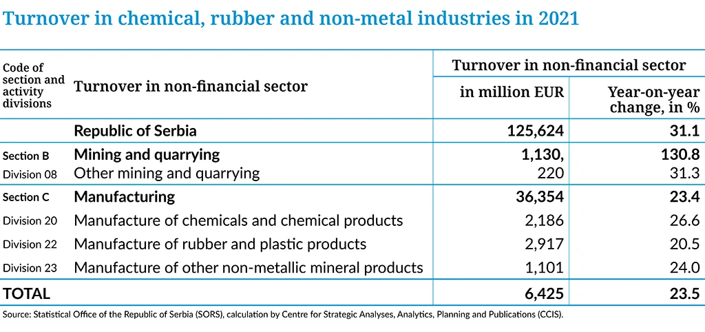 The total realized turnover, i.e. the total value of sold products and services in the non-financial business economy in the Republic of Serbia, in 2021, amounted to EUR 125.6 billion, which constitutes a year-on-year growth of 31.1%. In 2021, the chemical, rubber and non-metal industries recorded the total turnover of EUR 6.4 billion, which accounts for 5.1% of the realized turnover in the non-financial business economy in the observed year. Since 2017, the turnover in these industries has recorded the progressive year-on-year growth rates.