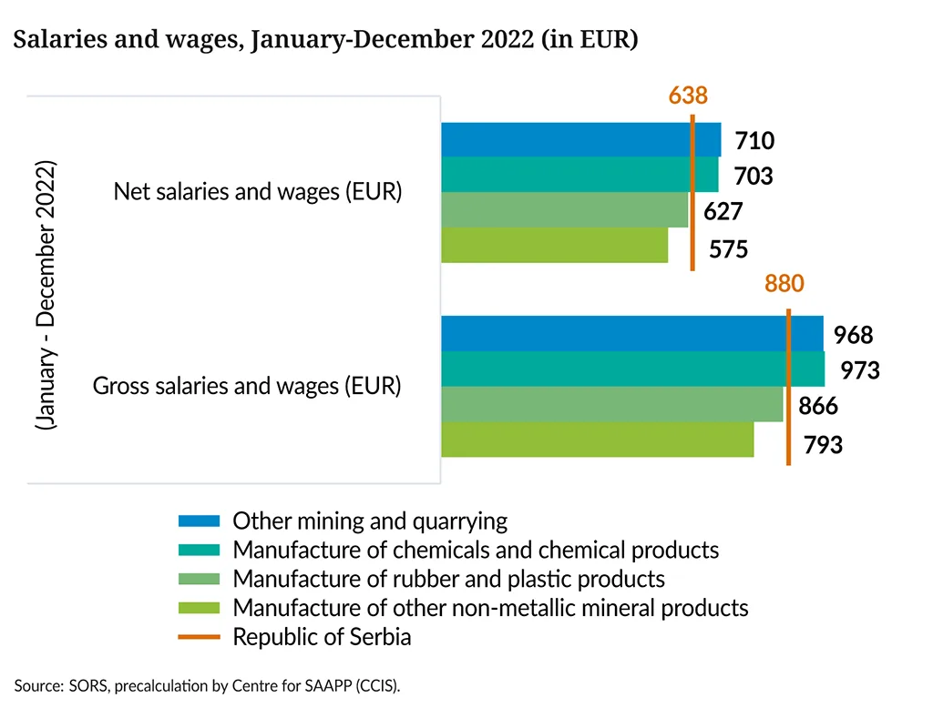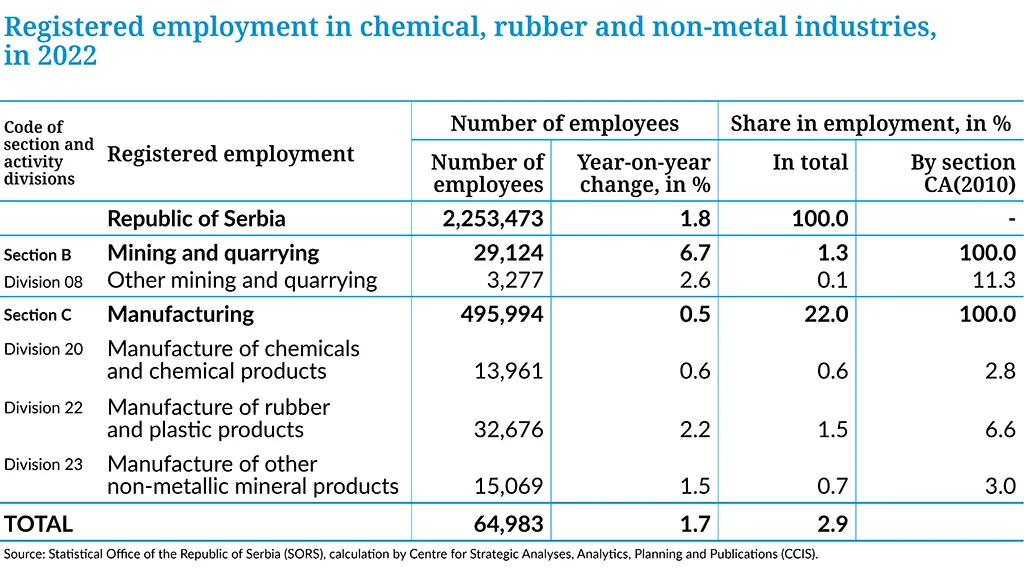 In the total number of employees in the Republic of Serbia, the share of employees in the chemical and rubber industry, manufacture of non-metallic mineral products and other mining and quarrying is 2.9%. The five-year average growth of employees (2018–2022) in the above industries amounts to 3.3%.