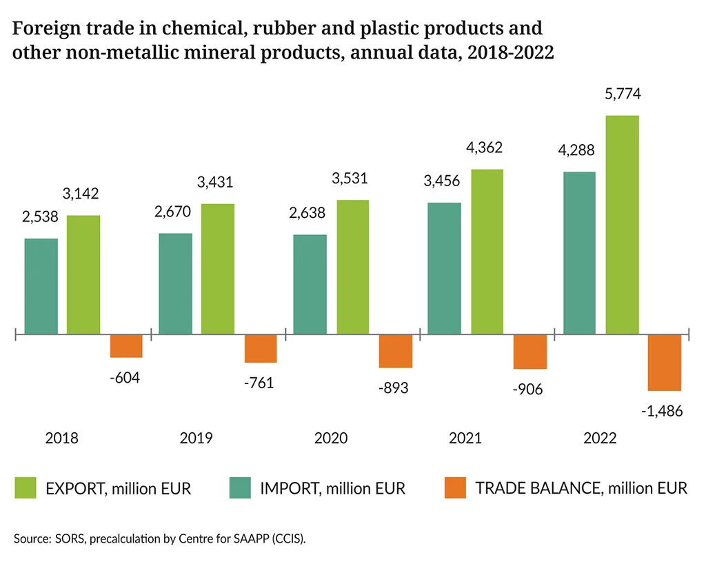 The deficit in foreign trade in chemical, rubber and plastic products and other non-metallic mineral products amounted to EUR 1.5 billion, with the coverage of import by export of 74.3%. The highest export was recorded with rubber and plastic products (EUR 2.2 billion), which is higher by 17.4% as compared with 2021, along with the recorded positive foreign trade balance (EUR 660.4 million).